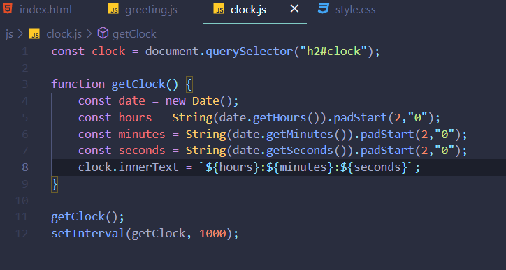 setInterval(getClock, 1000); 1초(1000ms)간격으로 getClock을 실행함.