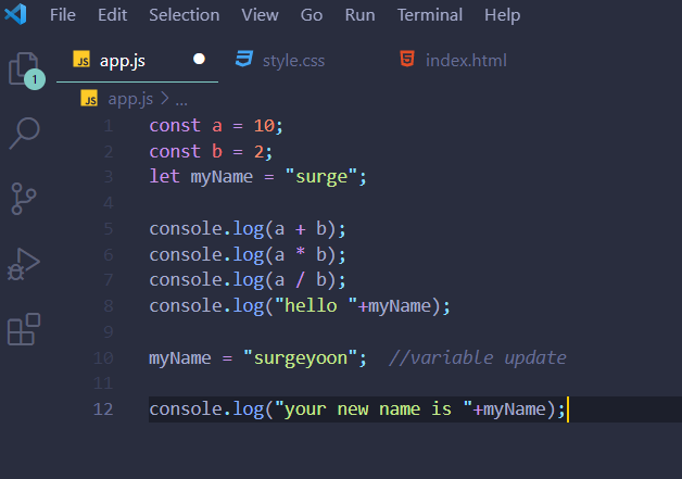 - variable 문자열 작성법 : my name(X) myname(X) myName(O) 띄어쓰기가 필요할 때 대문자로 작성